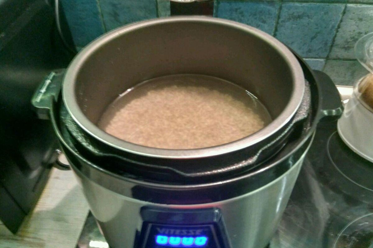 4. Réglez le multicuiseur sur le mode «Sarrasin», fermez le couvercle et faites cuire de 50 minutes à 1 heure 10 minutes, selon le type d'orge perlé; il est recommandé après 50 minutes de cuisson de goûter l'orge pour la préparer.