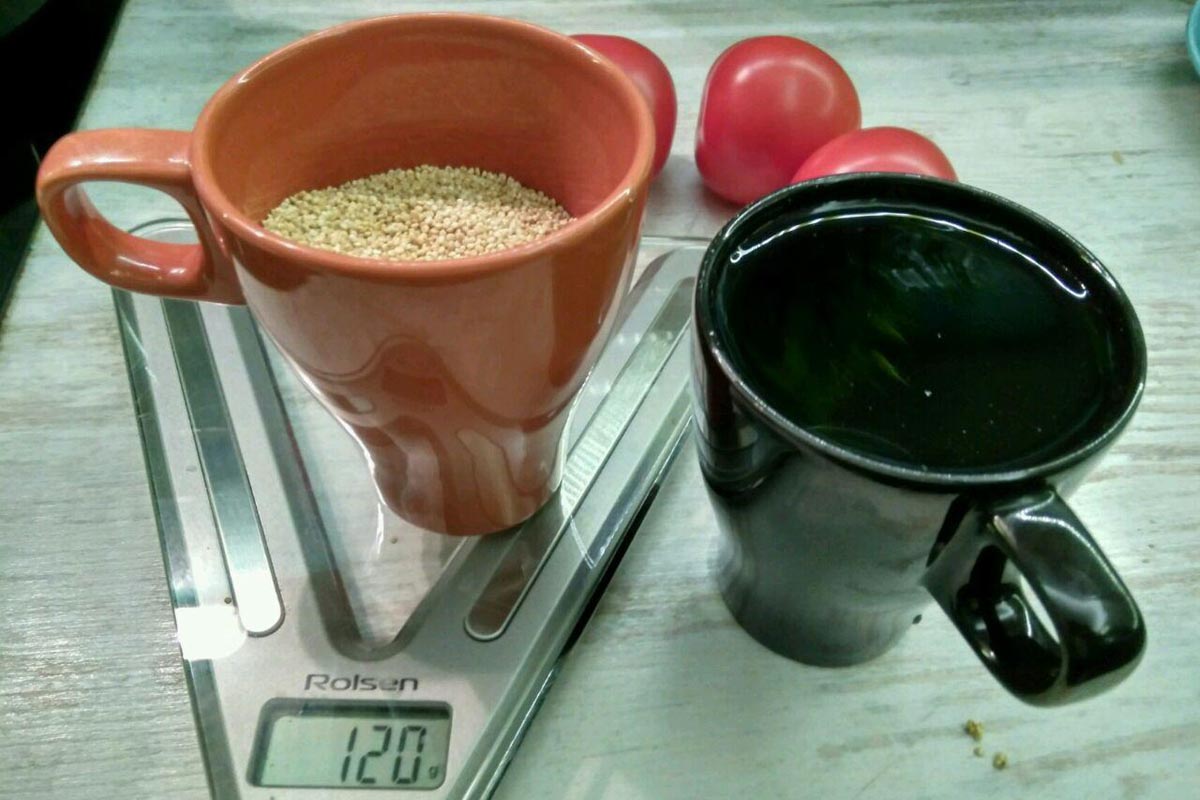 1. Versez le quinoa dans une casserole, lavez en broyant les grains et versez de l'eau froide 1: 2 - 1 verre d'eau pour un demi-verre de quinoa.