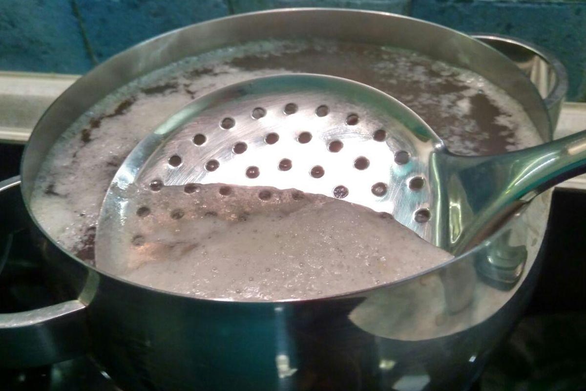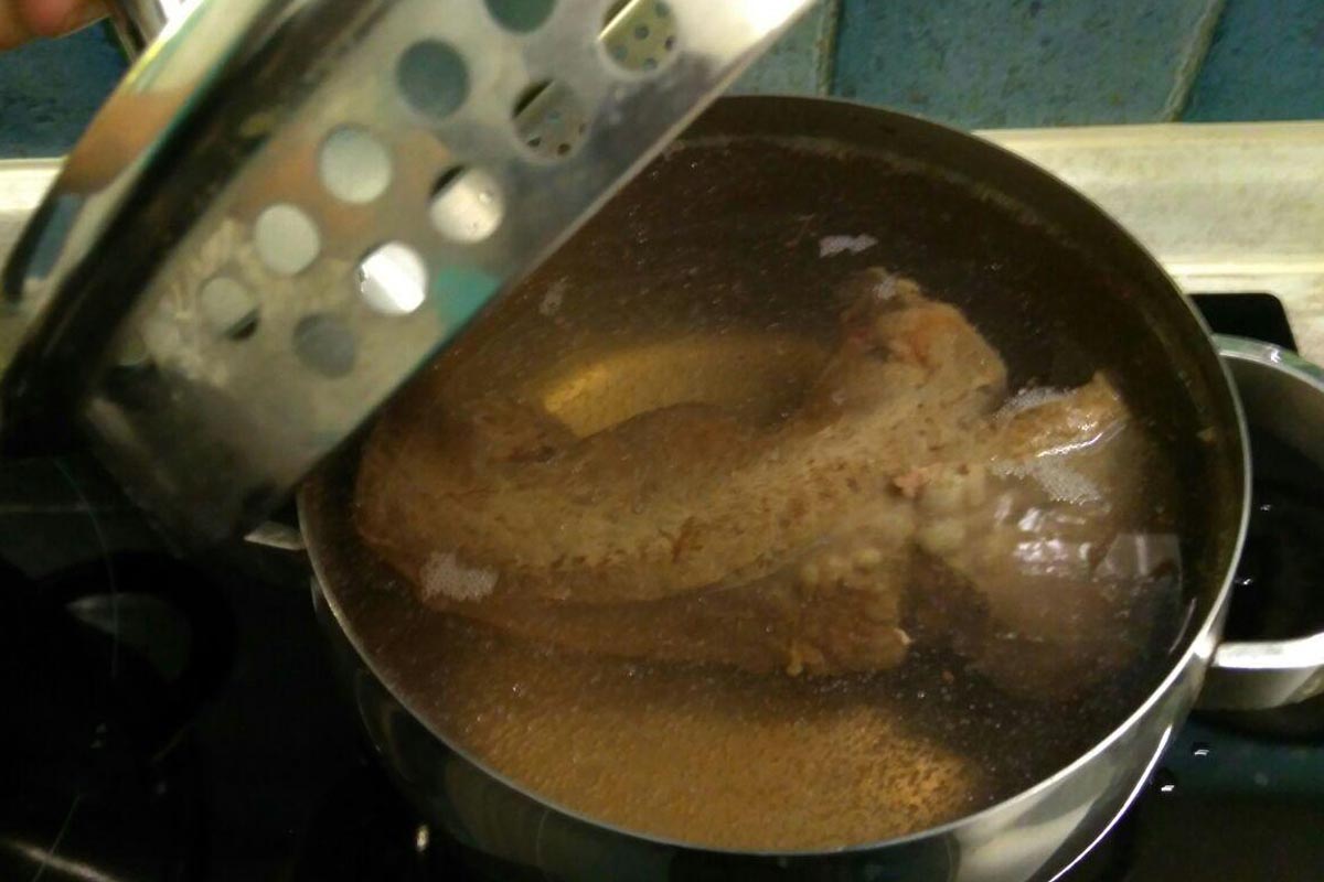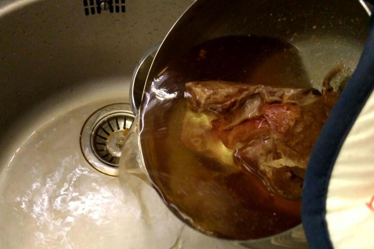 3. Après une demi-heure de cuisson, égouttez le premier bouillon et versez-y de l'eau fraîche bouillante - il est pratique de faire bouillir une bouilloire pleine à ce moment. Vous avez besoin de beaucoup d'eau, car le cœur prend beaucoup de temps à se préparer et l'eau s'évapore lentement de la casserole.