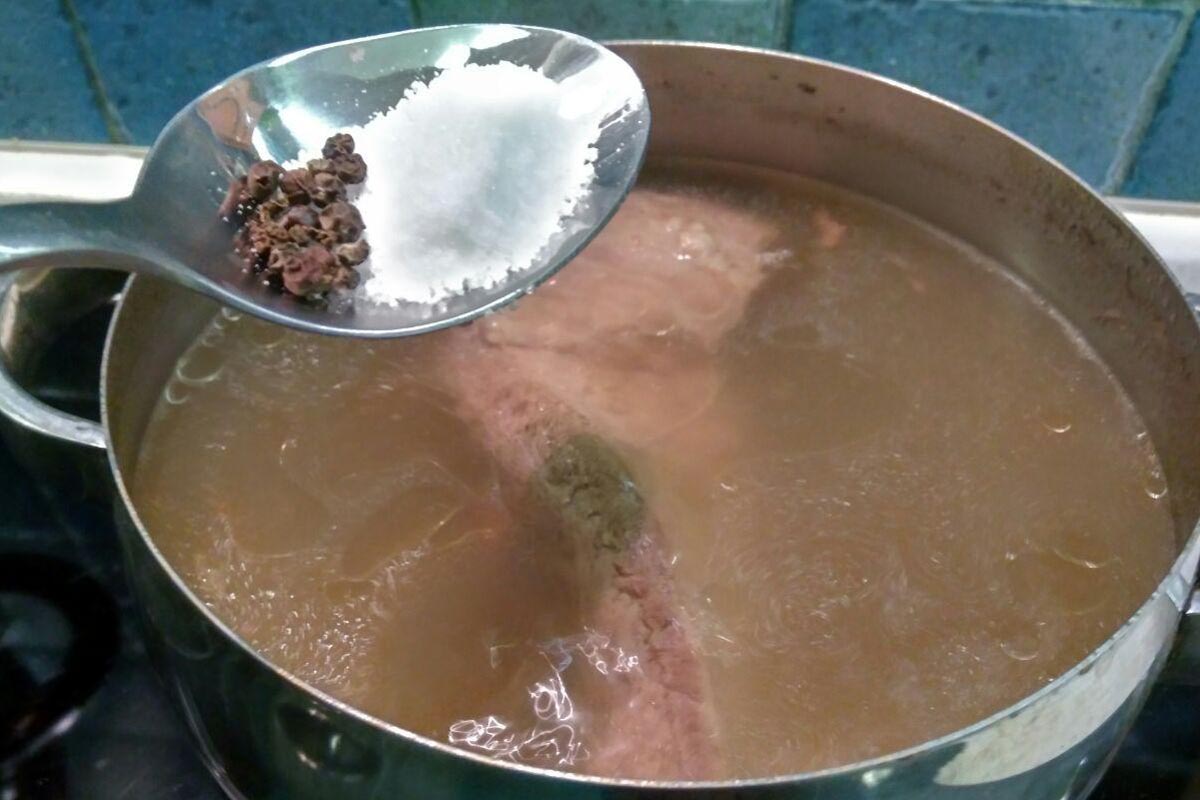 4. Attendez qu'il bout et après une demi-heure de cuisson ajoutez un peu de sel à l'eau - juste légèrement pour que le cœur ne devienne pas dur. Au même stade, si vous le souhaitez, ajoutez des épices - poivre noir, céleri-rave, feuille de laurier.