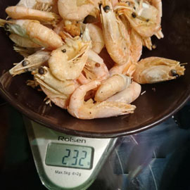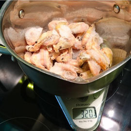 - Pesons nos crevettes bouillies surgelées en taille 90x120 (crevettes moyennes ordinaires): poids 320 grammes.